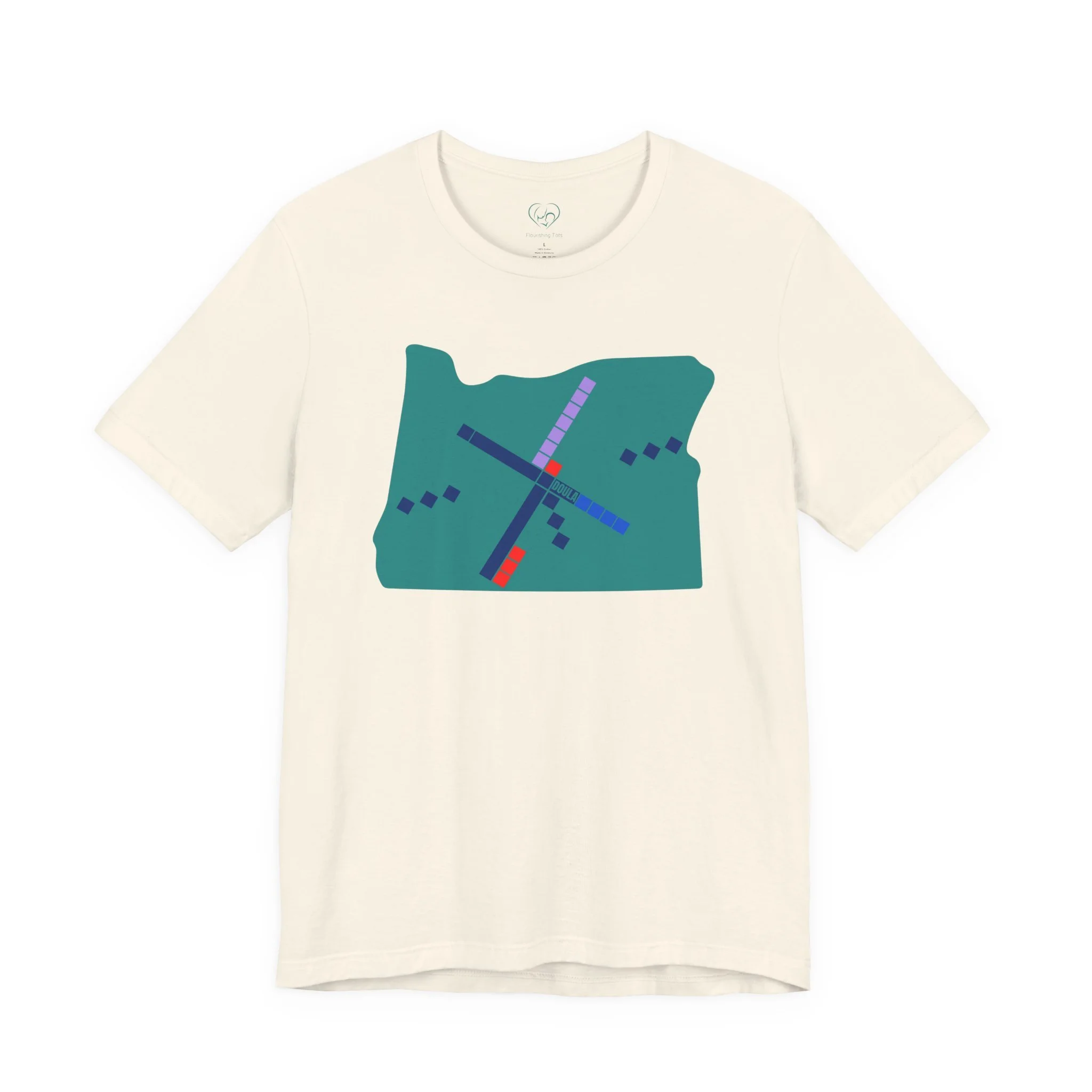 This tee lives in moments: morning coffee on a porch, sketching transit lines in a notebook, or swapping route stories with friends. The design reads like a compact map — familiar to people who love city grids, small airports, or regional quirks — and the soft hand and retail fit make it work for active weekends and everyday downtime alike.